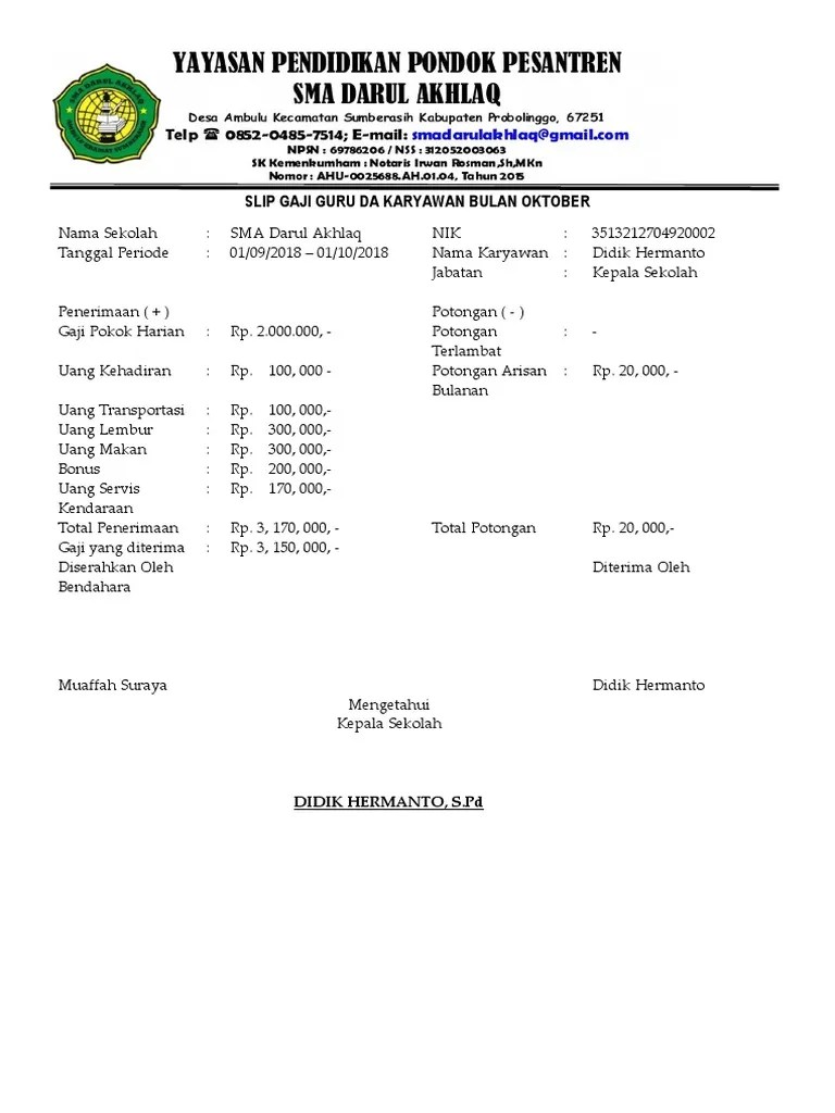 Contoh slip gaji karyawan wiraswasta bisa juga buat guru honorer .